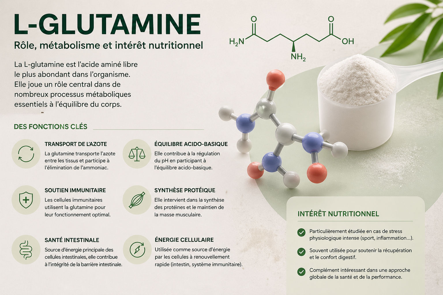 La L-glutamine est souvent évoquée en nutrition, notamment dans les contextes de sport ou de digestion. Mais au-delà des discours marketing, c’est avant tout un acide aminé central dans le métabolisme humain.