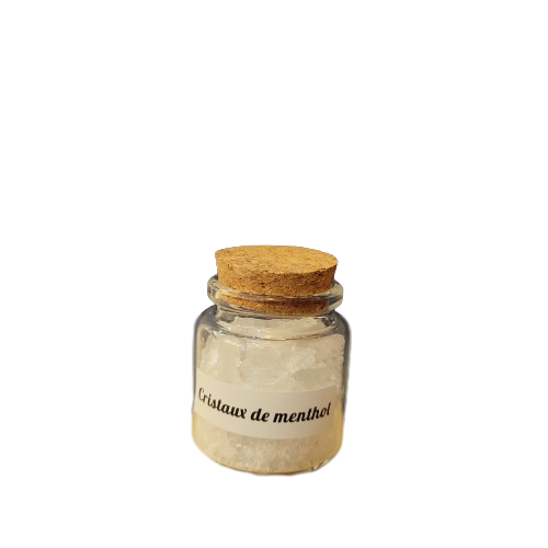 Les cristaux de Menthol vendu dans un flacon en verre avec un bouchon en liège.