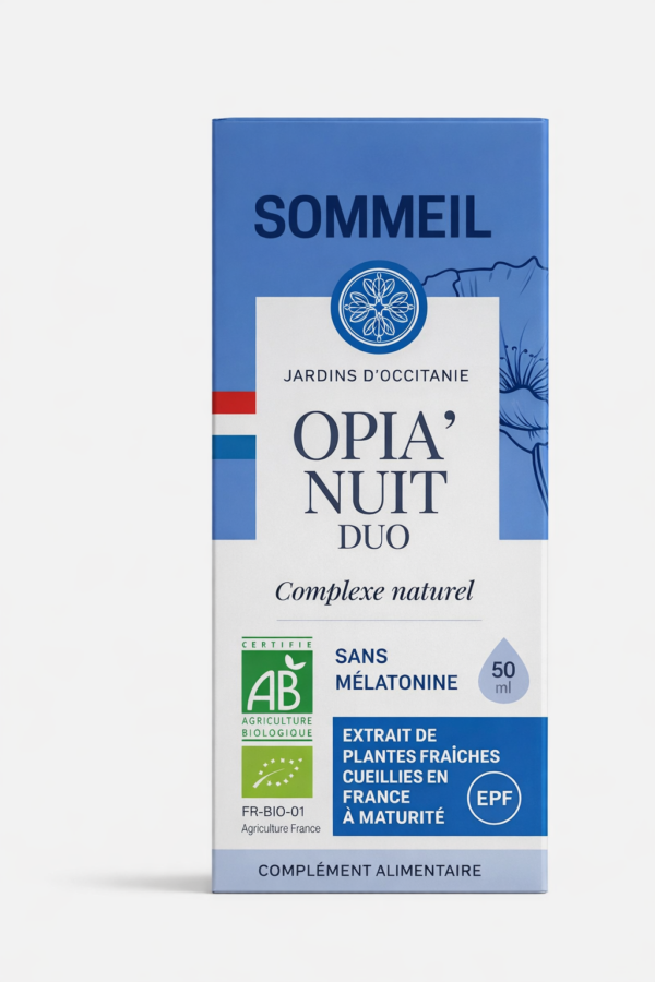 Opia’Nuit Duo Bio est un complément alimentaire liquide élaboré à partir de plantes fraîches issues de cultures biologiques. Présenté en flacon compte-gouttes, il se dilue facilement dans un peu d’eau pour une prise simple au quotidien.